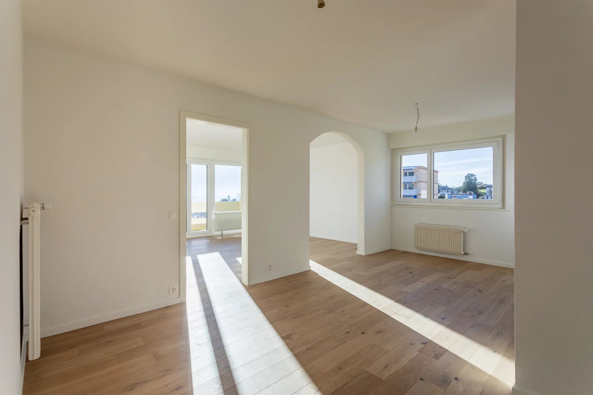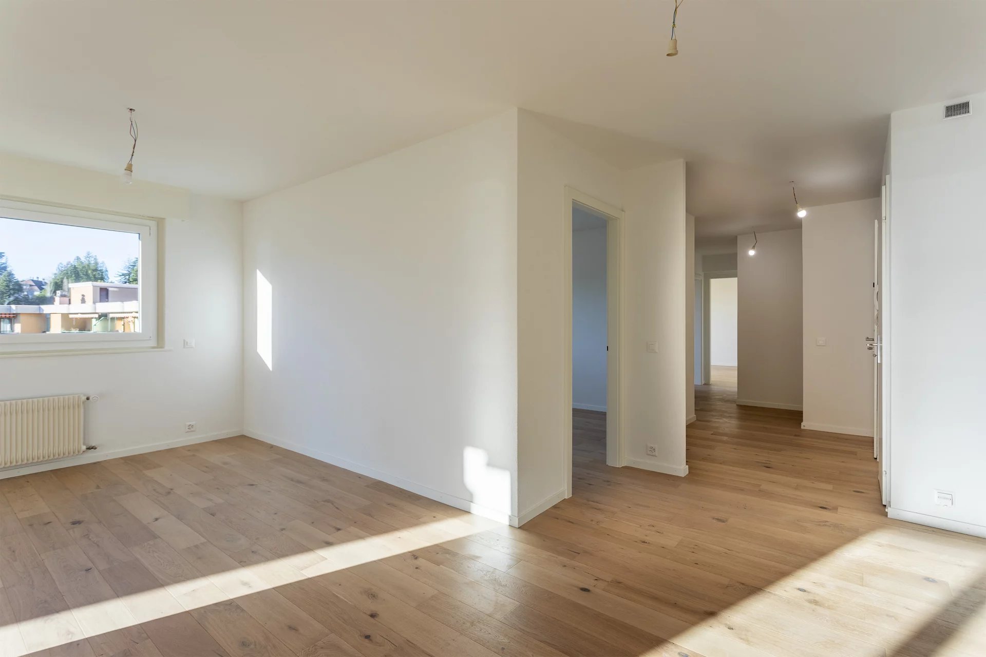 Prêt à habiter : Ce superbe appartement de 4,5 pièces, entièrement rénové en 2023, offre trois chambres spacieuses, un salon confortable, ainsi qu'une cuisine moderne ouverte sur la salle à manger.